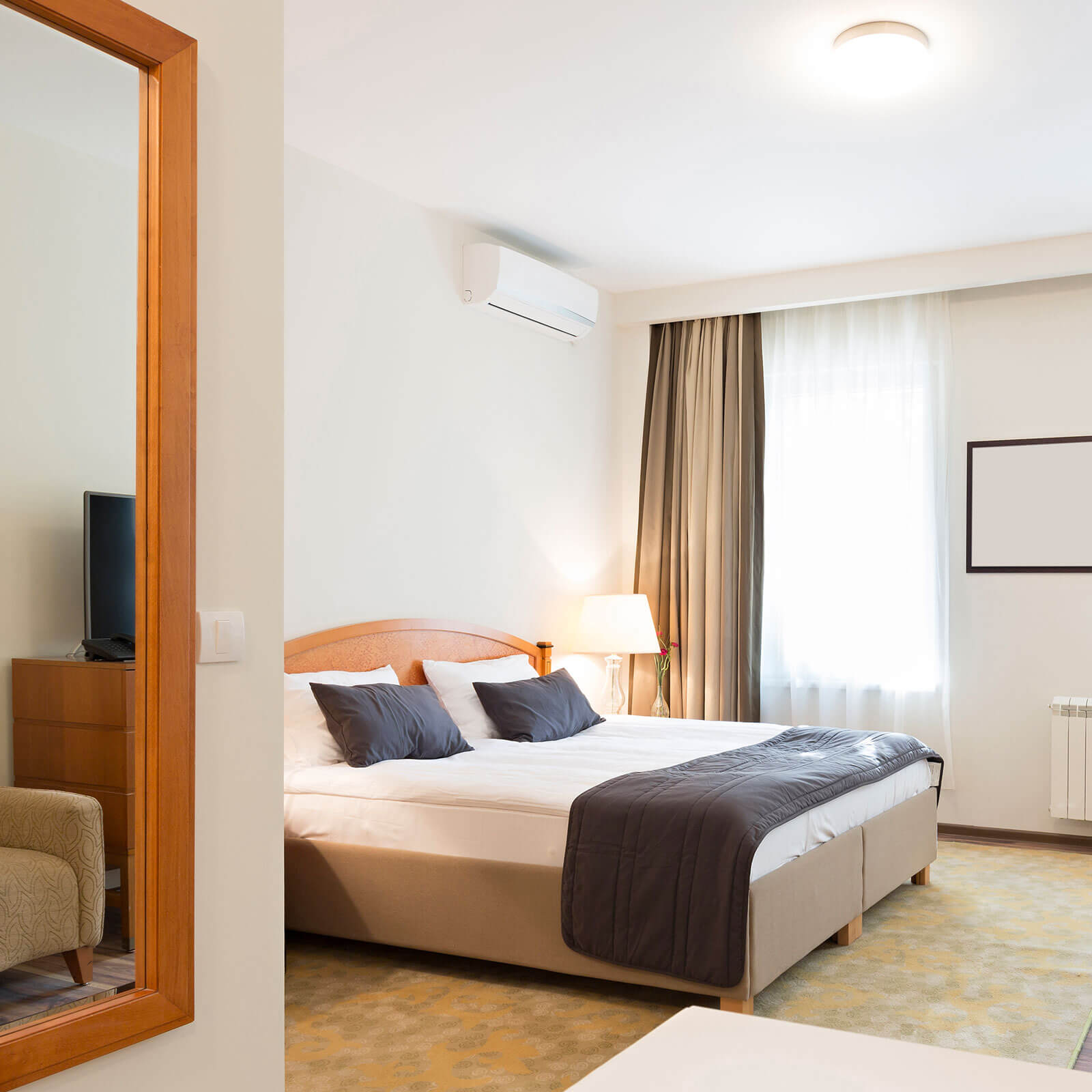 These rooms were designed with open-concept living area and are very bright & spacious – they are available with either double or queen beds. Room sizes are different – from 30 to 35 sqm. The interior is made with a warm-palette tons of walls and furniture. A work desk and stationary set are at your disposal. Makeup mirror and chair are also included.